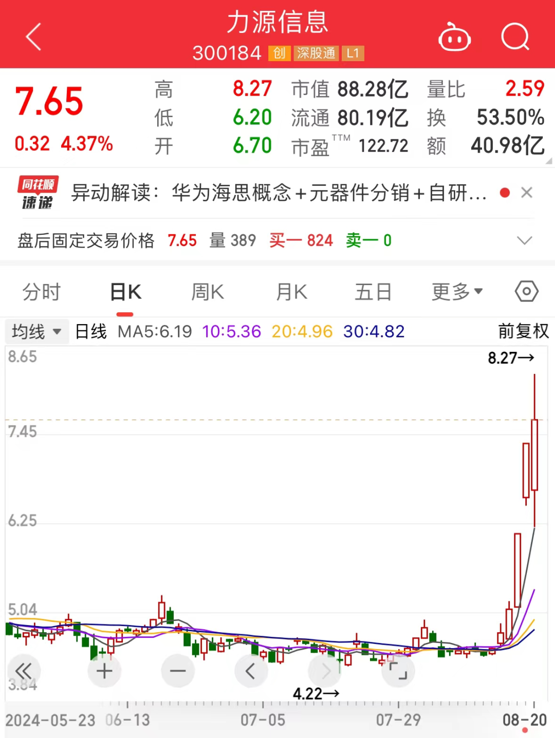 在见证四大行频频刷新历史高点的同时,今日A股的成交额冠军也创造了多年来的历史,为一只市值不足90亿元的个股——力源信息,全天成交额接近41亿元。得益于华为海思概念的崛起,该股已经连续5个交易日大幅放量。