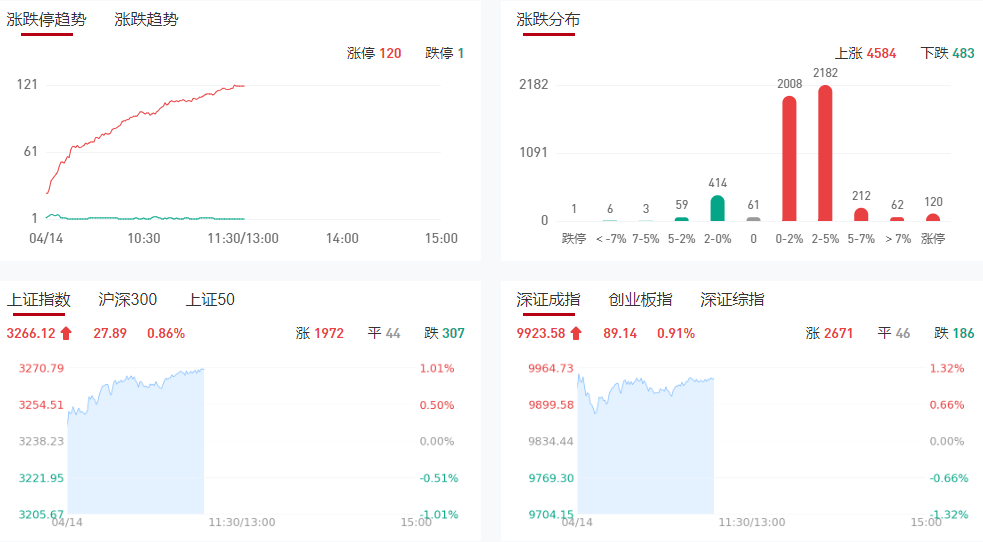 市场早盘震荡反弹,三大指数小幅上涨,沪深两市半日成交额8388亿,较上个交易日放量674亿。盘面上热点较主要集中在大消费方向,个股涨多跌少,全市场超4800只个股上涨。从板块来看,大消费股全线爆发,电商、体育、零售等多个方向大涨,南极电商等多股涨停。海南自贸区概念股集体走强,海汽集团等10余股涨停。创新药概念股表现活跃,东诚药业等涨停。