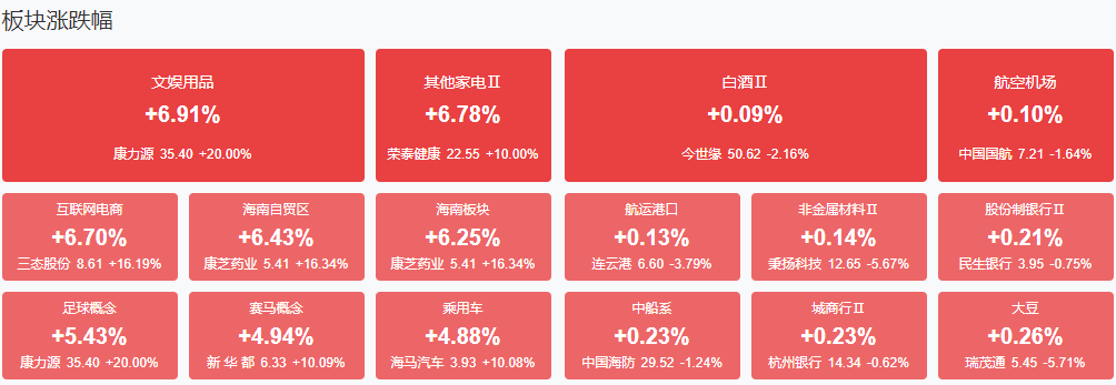 板块方面,电商、海南、体育产业、可控核聚变等板块涨幅居前,大豆等少数板块下跌。截至收盘,沪指涨0.86%,深成指涨0.91%,创业板指涨0.82%。