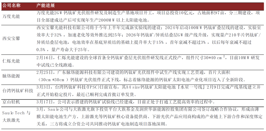 此外,宁德时代(根据供应商公开交流,正处于产线调试阶段)、仁烁光能(常熟150MW产线已于3月中旬全面开工,公司预计8月底主体竣工,三季度设备安装完毕)等企业百兆瓦量产中试线的进展亦值得重点关注。