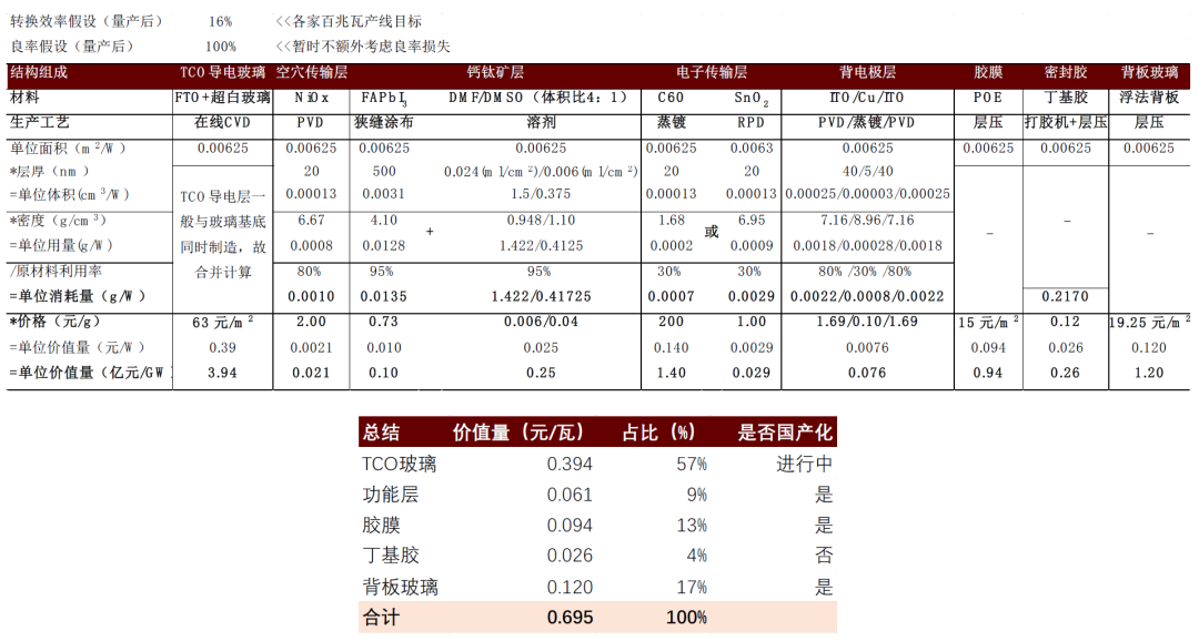 图表4:钙钛矿组件选材及价值量测算(以典型平面反式结构为例)