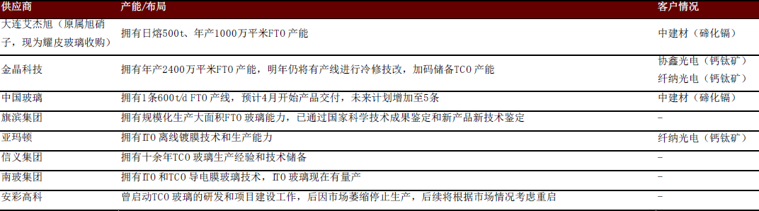 短期内,国内钙钛矿FTO玻璃的供应将是艾杰旭(耀皮)和金晶科技两强并立的格局。受限于市场规模和较高的技术门槛,国内只有少数几家企业拥有FTO生产能力。旭硝子是全球第二大玻璃制品公司,供货中建材等的碲化镉薄膜电池,其在中国境内生产FTO玻璃的大连艾杰旭已于2022年被耀皮玻璃收购,产能达1000万平米/年,是国内主要的FTO生产商。金晶科技目前已成功通过国内多家头部钙钛矿初创企业生产线认证,其FTO生产线增加了消除色差的工序因此尤其适合BIPV等应用场景,公司目前拥有2条合计产能2400万平米/年的FTO玻璃生产线,我们预计公司明年仍将有产线进行冷修技改,加码储备TCO产能。其余有FTO生产能力的中国玻璃、旗滨集团等,或是当前时点产能尚处爬坡、或是当前战略重心未放在TCO领域,短期内较难取得市场份额。在ITO、AZO玻璃领域,亚玛顿、南玻、信义等企业都已有布局,后续若这两种TCO玻璃在量产钙钛矿电池的应用出现突破,则这些厂商都将存在一定的入场机会。