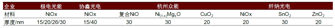 价值量方面,我们以PVD法制作空穴传输层的典型技术路线进行测算。通过专利资料查得NiOx单价约2元/g,基于20nm的空穴传输层厚度、16%的钙钛矿组件转换效率、以及80%的PVD设备原材料利用率,我们计算得出NiOx的材料用量为0.001g/w,结合单耗与单价,对应空穴传输层材料的单瓦价值量约0.002元/瓦。