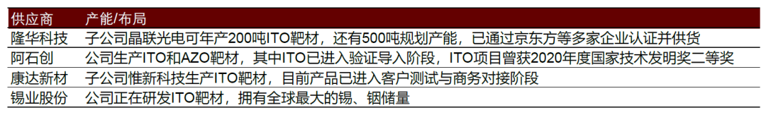 ITO膜的制备通常使用磁控溅射,核心材料为ITO靶材,由氧化铟和氧化锡两种金属氧化物的粉末进行混合后加工成ITO复合粉体后压制、高温烧结而成。目前,我国约有一半的ITO靶材来源于进口,特别是在高端ITO靶材如TFT-LCD、触控屏用 ITO靶材领域的主要市场份额被IX日矿和三井等日韩企业占据,国内企业还在从低端产品迈向高端的进程中,其中参与较多的上市公司包括隆华科技、阿石创、康达新材等。