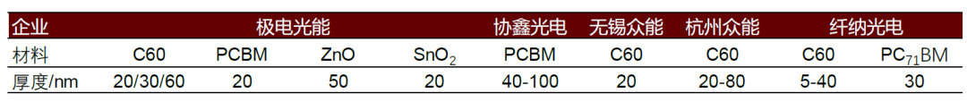 价值量方面,我们以蒸镀C60+RPD金属氧化物的典型技术路线进行测算。我们通过调研获得C60单价约200元/g,通过询价获得SnO2单价约1元/g,基于20nm的电子传输层厚度、16%的钙钛矿组件转换效率、30%的蒸镀和RPD原材料利用率、以及1:9的C60:SnO2的用量配比(假设),我们计算得出电子传输层的C60/SnO2单耗分别为7e-5g/瓦、0.0026g/瓦,价值量合计0.017元/瓦。