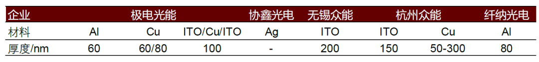 背电极层。背电极对钙钛矿电池的电荷收集起到至关重要的作用,Au、Ag、Al、Cu等金属都是实验室中常见的背电极材料,其中Au、Ag的导电性能好但由于成本原因不适合于量产。除此之外,在实际的长时间应用中金属背电极容易透过电子传输层扩散到钙钛矿层,造成钙钛矿材料的降解和变性,导致电池性能退化。而透明金属氧化物ITO尽管导电性较差,但却不易发生扩散,同时其透光性也为透明钙钛矿电池的实现提供了可能。量产钙钛矿电池常用150nm的全ITO背电极或40/5/40nm的ITO/Cu/ITO复合背电极。ITO电极较Cu电极或ITO/Cu/ITO复合电极厚度更厚,主要系为了弥补ITO较差的导电性,需要使用比Cu等金属背电极更大的层厚,以减小电荷流动所受阻碍,避免增加电池的串联电阻Rs,从而实现相同的输出功率表现。