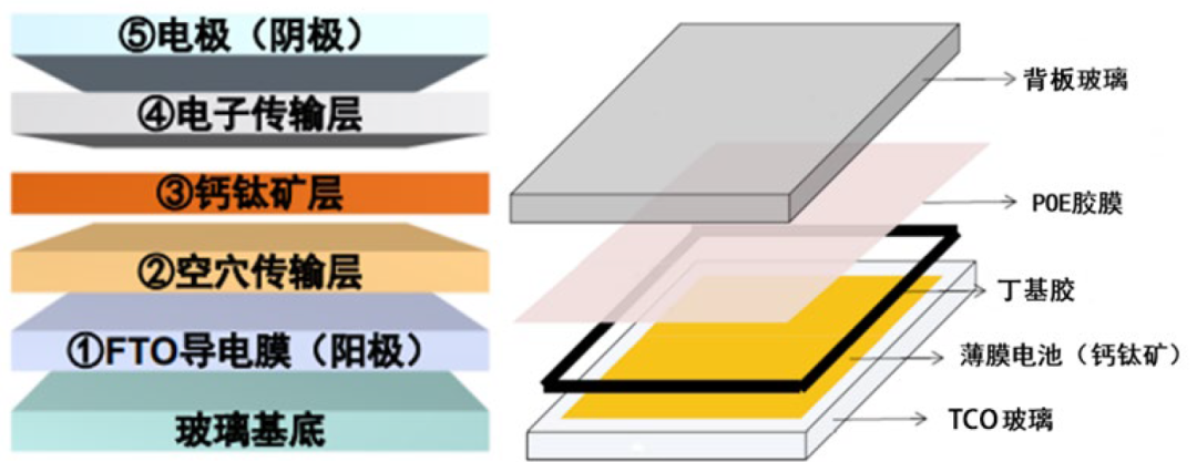 作为薄膜太阳能电池,钙钛矿电池由多种功能、厚度不同的薄膜层叠而成,膜层的选材、厚度等都直接影响着电池的性能。以当前量产规划中最常见的平面反式结构为例,钙钛矿电池按照制造顺序依次是TCO透明导电玻璃层、空穴传输层、钙钛矿层、电子传输层和背电极层。而在将电池封装成组件的过程中,则需要在电池的背电极之上叠放背板玻璃,并用POE胶膜和丁基胶进行层压封装,最终构成钙钛矿组件的完整结构,如下图所示。