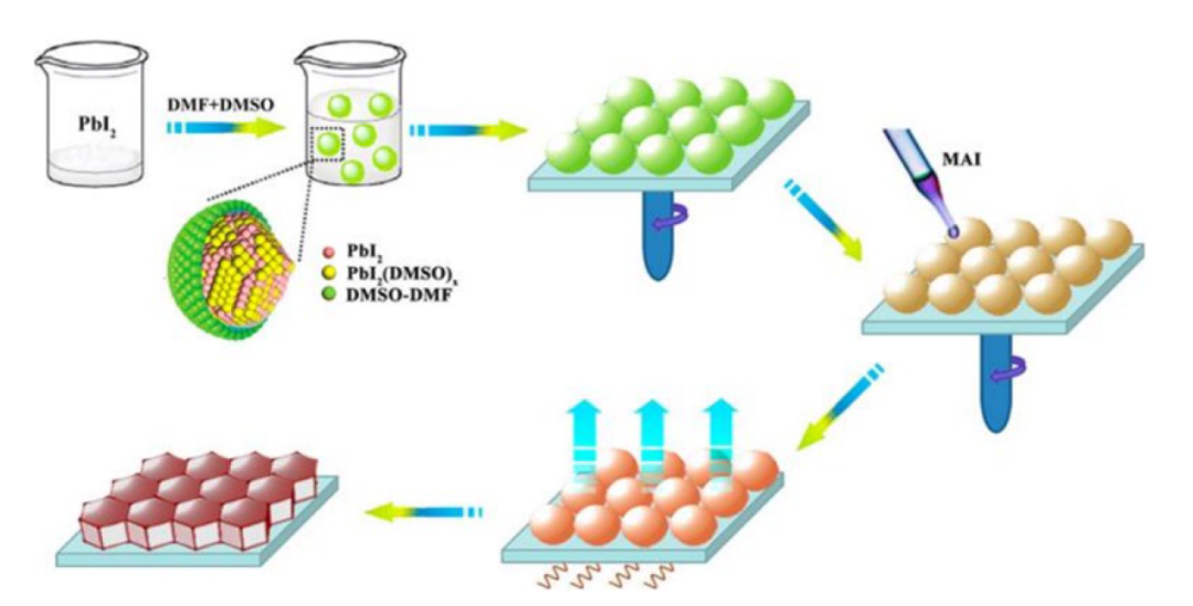 由于量产钙钛矿层多使用溶液涂布法制备,所以可通过溶剂工程对钙钛矿前驱体溶液的溶剂组分合理选择和控制,以达到有效调控钙钛矿表面形貌的效果。目前比较常见的溶剂选择为二元溶剂,例如以DMF作为主要的溶剂,并以一定比例掺杂DMSO(如4:1)。相较于单组分DMF,加入的DMSO极性更强、沸点更高,因此能与碘化铅形成更强作用的路易斯酸碱加合物,从而在退火过程中挥发转变为更高质量的钙钛矿晶体,提升电池性能。