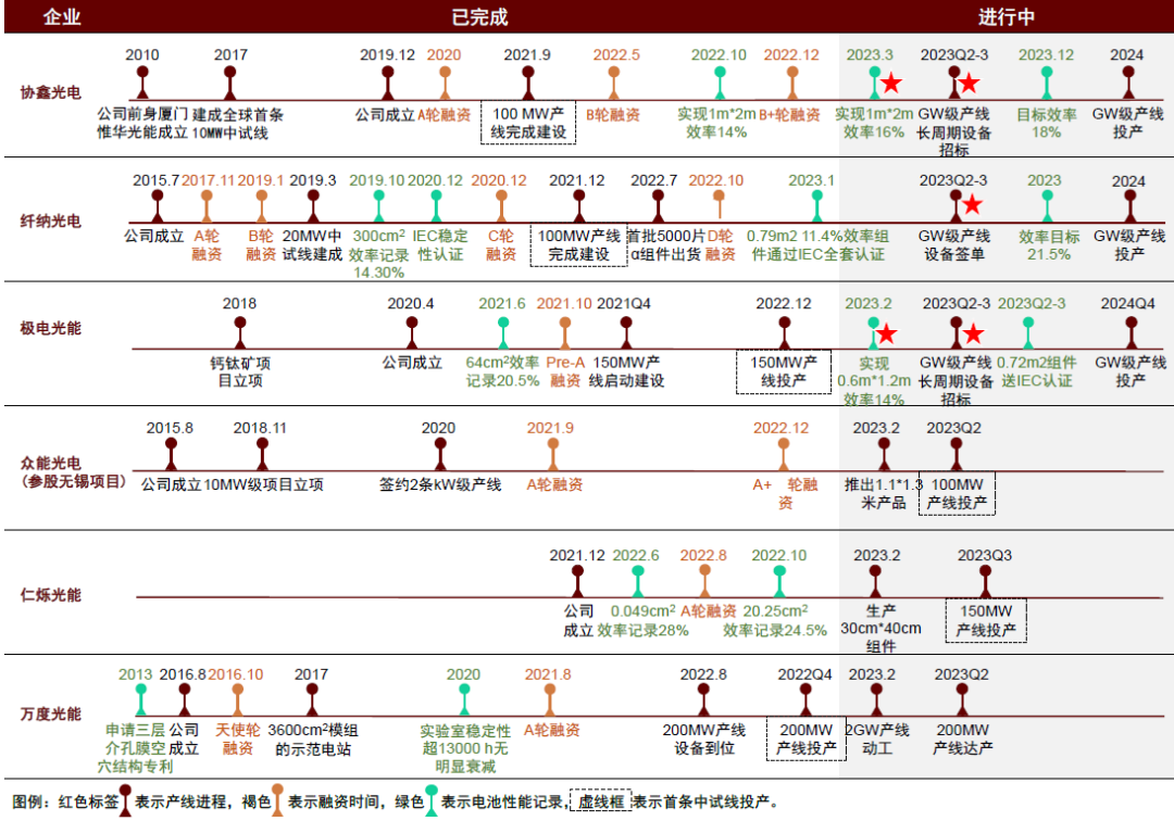 图表1:钙钛矿头部公司产线进展(截至2023年3月)*标星为2Q23钙钛矿板块投资重点关注方向