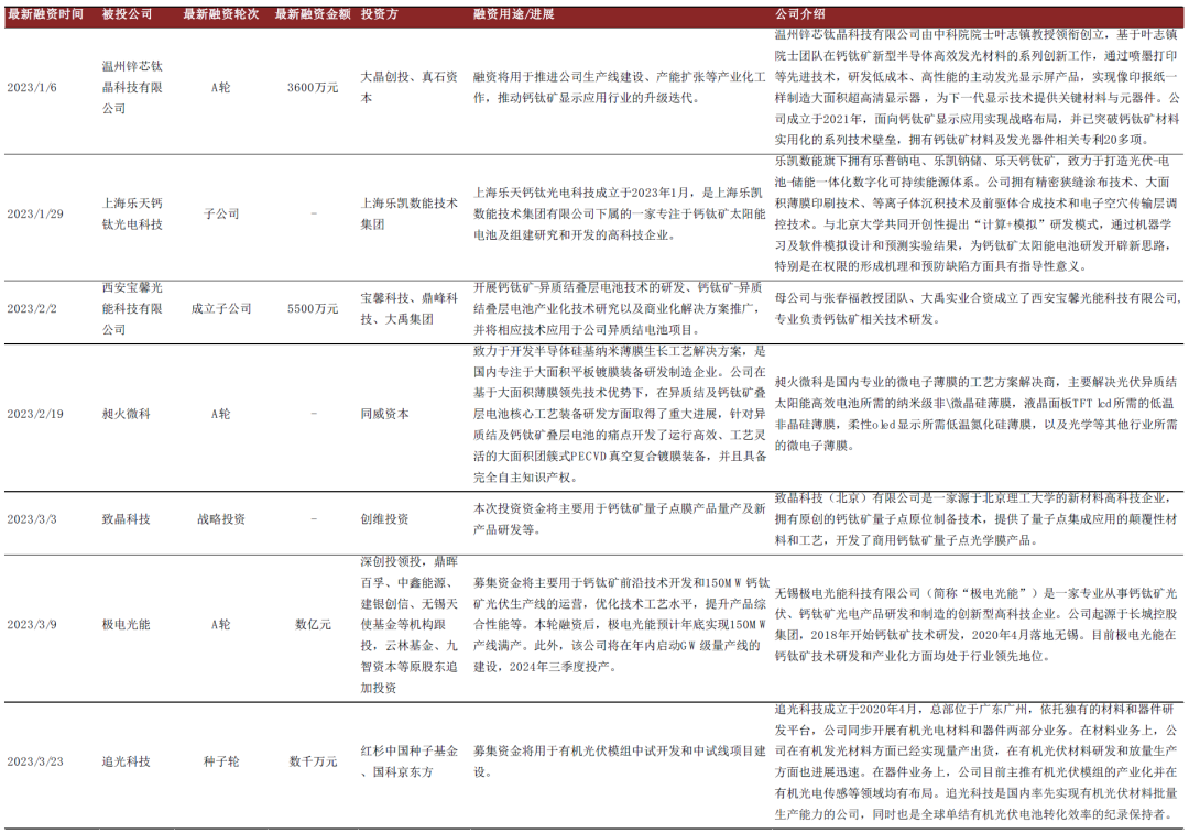 图表13:钙钛矿行业投融资活动一览(2023.01-2023.03)
