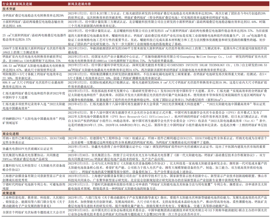 我们梳理1Q23到2Q23,钙钛矿板块值得关注的重点事件包括: