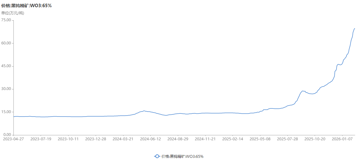 据Choice数据,截至2月12日,黑钨精矿(品位≥65%)均价为69.6万元/吨,年内涨幅约51.6%。