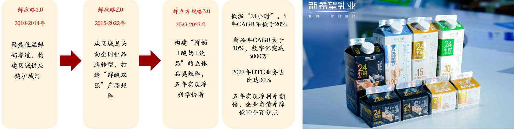 公司聚焦低温业务,锚定盈利目标。公司2010年正式提出“鲜战略”,聚焦低温鲜 奶赛道,构建区域供应链护城河;2015年“鲜战略”进入2.0阶段,不断深耕全国区域及产业链,从区域龙头逐渐向全国性品牌转型,打造“鲜酸双强”产品矩阵;2021年公司发布“鲜立方战略”,构建“鲜奶 + 酸奶 + 饮品”的立体品类矩阵,满足消费者的多层级、多场景、多元化的新鲜营养需求。2023年公司发布“五年战略规划”,目标2023至2027年实现低温“24小时”CAGR不低 于20%,新品CAGR大于10%,数字化突破5000万,DTC业务占比达30%, 五年实现净利率翻倍。