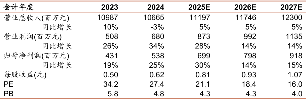 预计公司25-27年利润分别6.99、7.98、9.18亿人民币,对应eps分别为0.81、0.93、1.07元。