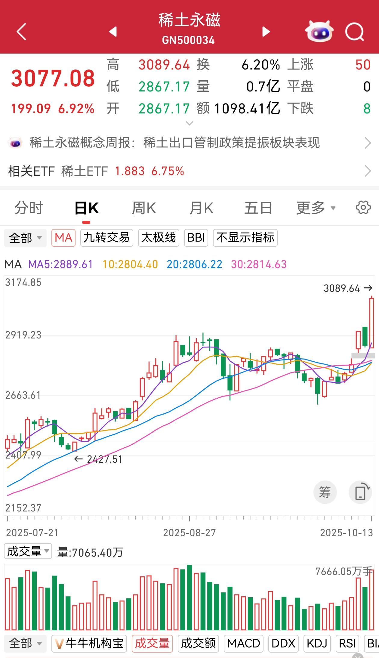 市场热点方面,有色金属概念再度全线走强,稀土永磁方向领涨,板块指数单边上扬,放量大涨5.66%,创历史新高。九菱科技一度冲击30%涨停,银河磁体、新莱福、惠城环保等多股20%涨停,包钢股份、北方稀土、中国稀土等逾20只个股涨停或涨超10%。