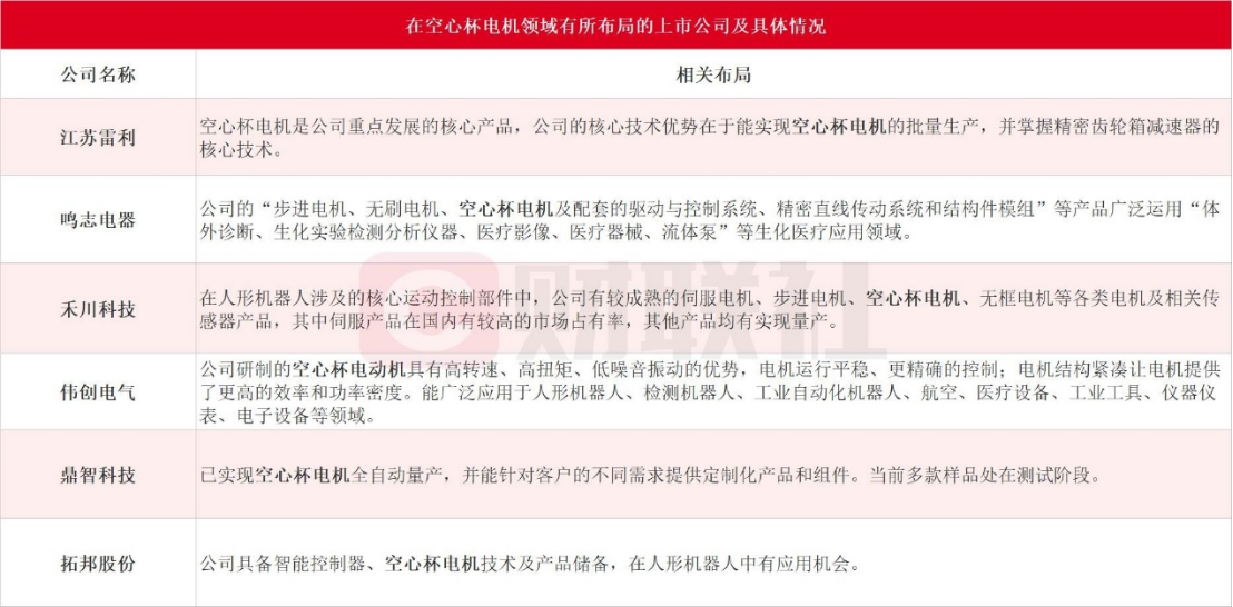 竞争格局方面,民生证券邓永康等人6月24日研报指出,全球空心杯电机市场的主要制造商包括Faulhaber、Portescap、Allied Motion Technologies等公司,这三家顶级制造商占据了市场份额的65%以上。财通证券指出,国内具备空心杯电机量产化能力企业较少,随着特斯拉人形机器人的国产化,国内空心杯电机将有望切入人形机器人市场。据财联社不完全统计,在空心杯电机领域有所布局的A股上市公司包括江苏雷利、鸣志电器、禾川科技、伟创电气、鼎智科技和拓邦股份等,具体如下: