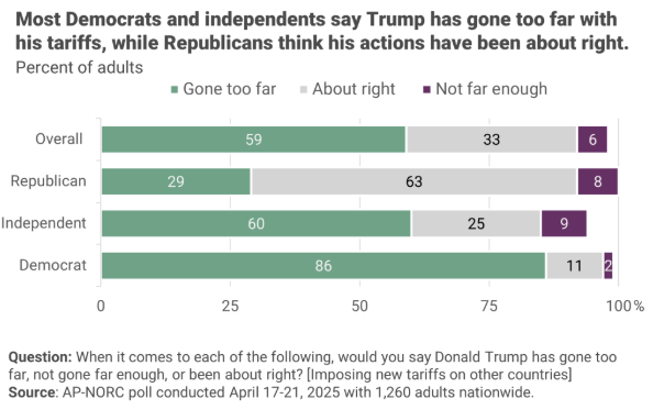 调查结果显示,接近六成(59%)的美国民众认为美国政府在关税问题上“做得太过了”,具体来看,民主党人占比较大,而大多数共和党人仍认为特朗普的做法是正确的。