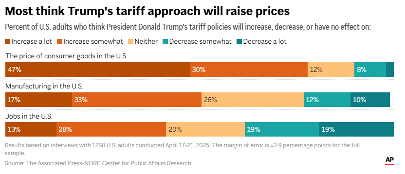 目前距离特朗普上任已经过去了三个月,然而他在经济和关税问题上的处理方式令不少人质疑。美联社-NORC公共事务研究中心于4月17日至21日面向1260名成年人展开一项调查,询问了他们对于关税、通胀、物价等方面的看法。