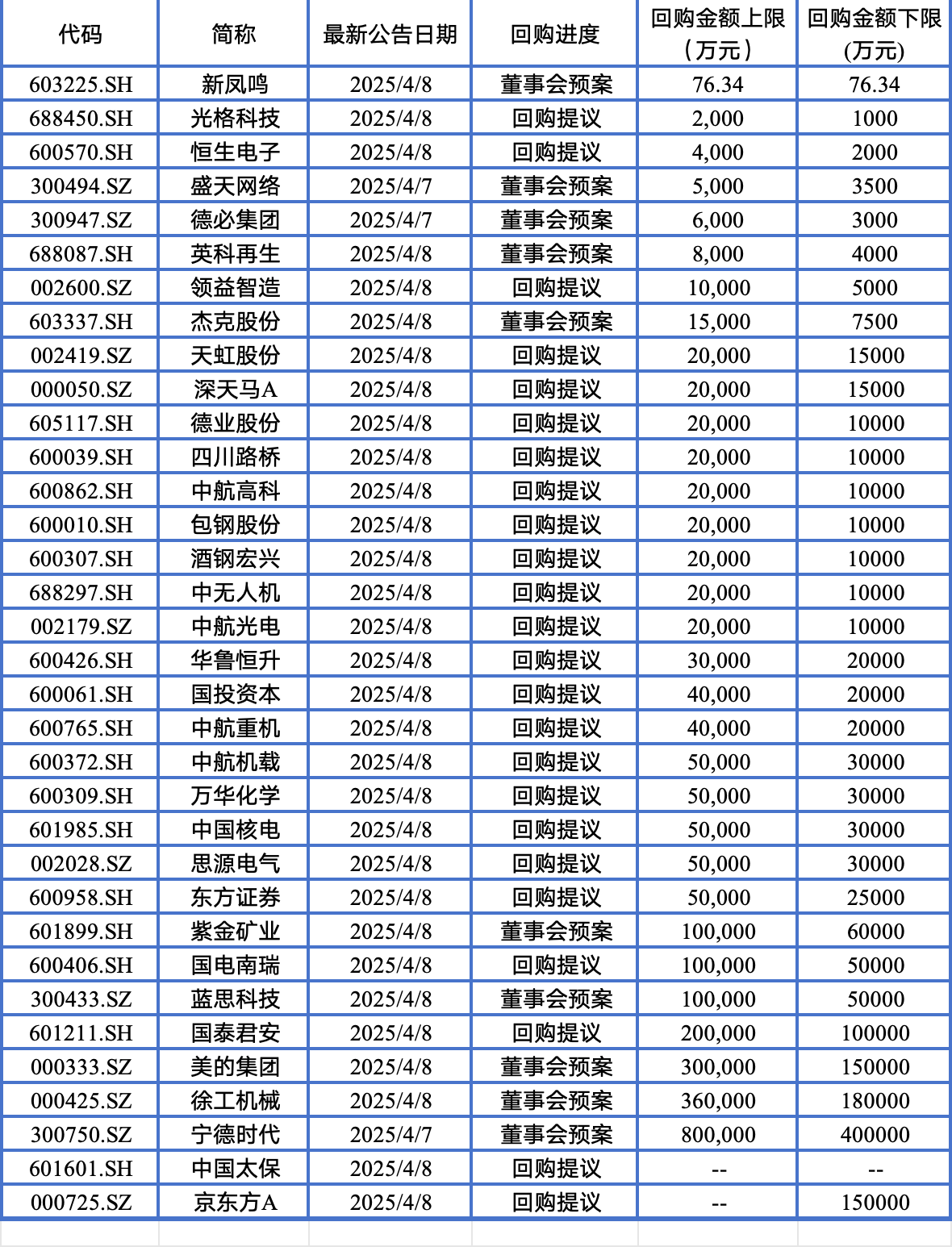 4月8日早间,中央汇金、中国诚通、中国国新集体表示,出手增持中国股票资产。紧接着,A股公司接过回购接力棒,深天马A(000050.SZ)、四川路桥(600039.SH)均发布了相关公告。另有多家公司表态将增持公司股份。