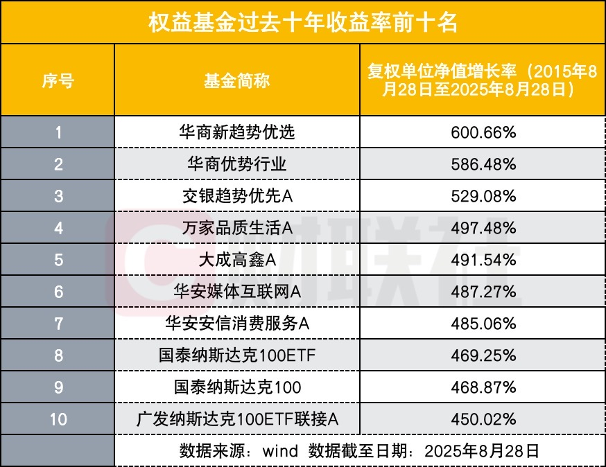 2015年8月28日至2025年8月28日之间,国泰纳斯达克100ETF的收益为469.25%,而万家品质生活A、大成高鑫A、华安媒体互联网A、华安安信消费服务A的收益均超过480%,华商优势行业、交银趋势优先A的收益更是超过500%。