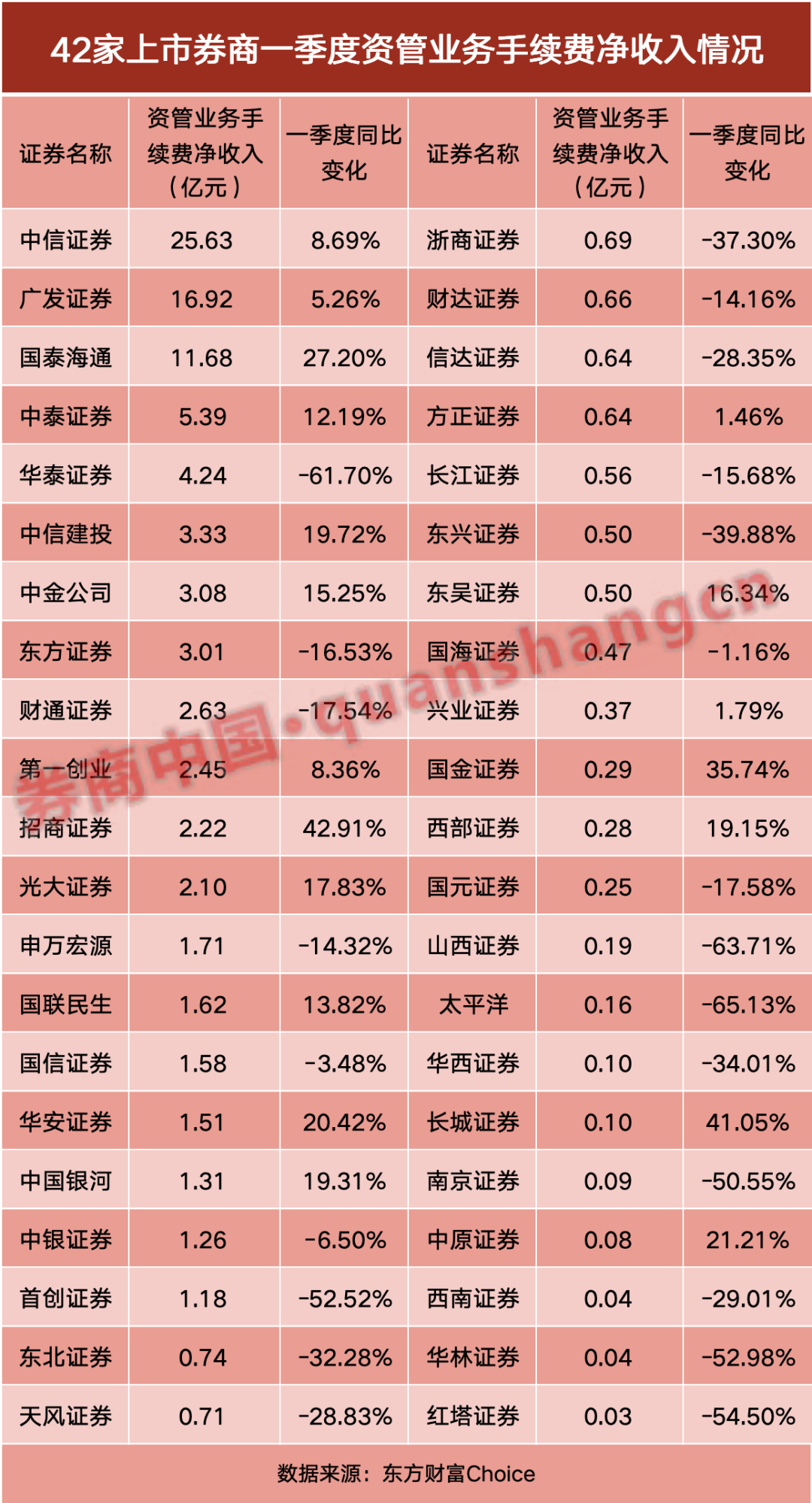 经纪业务一季度表现则全面向好。据券商中国记者统计,今年42家上市券商的经纪业务手续费净收入均实现增长,增幅的中位值达到48%。