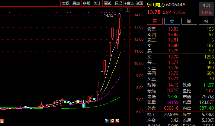 乐山电力日K线连续10日收阳线,其中7日涨停,累计大涨逾96%,股价创近10年来新高(复权,下同)。西昌电力日K线亦10连阳,收获4个涨停板,累计大涨逾68%,股价更是创历史新高。华银电力、韶能股份、宁波联合等也纷纷走出连续涨停行情。