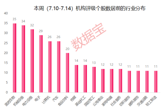 从申万一级行业来看,医药生物有35股获评级,位居所有行业首位;机械设备行业有34股,次之;电力设备有32股上榜,排名第三。