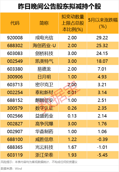 从股价表现来看,16只拟减持股5月以来股价平均上涨7.38%,行情表现显著优于大盘;成电光信、海创药业-U、剑桥科技、凯美特气5月以来股价均上涨超18%。