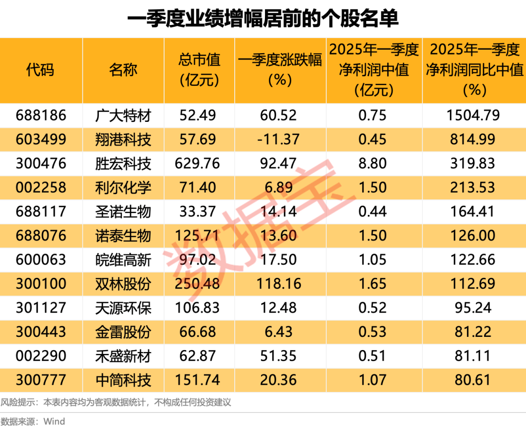从净利润增幅预估中值来看,广大特材、翔港科技、胜宏科技、利尔化学、圣诺生物等8股的净利润同比呈现翻倍。还有天源环保、金雷股份、禾盛新材、中简科技的一季度净利润增幅居前。