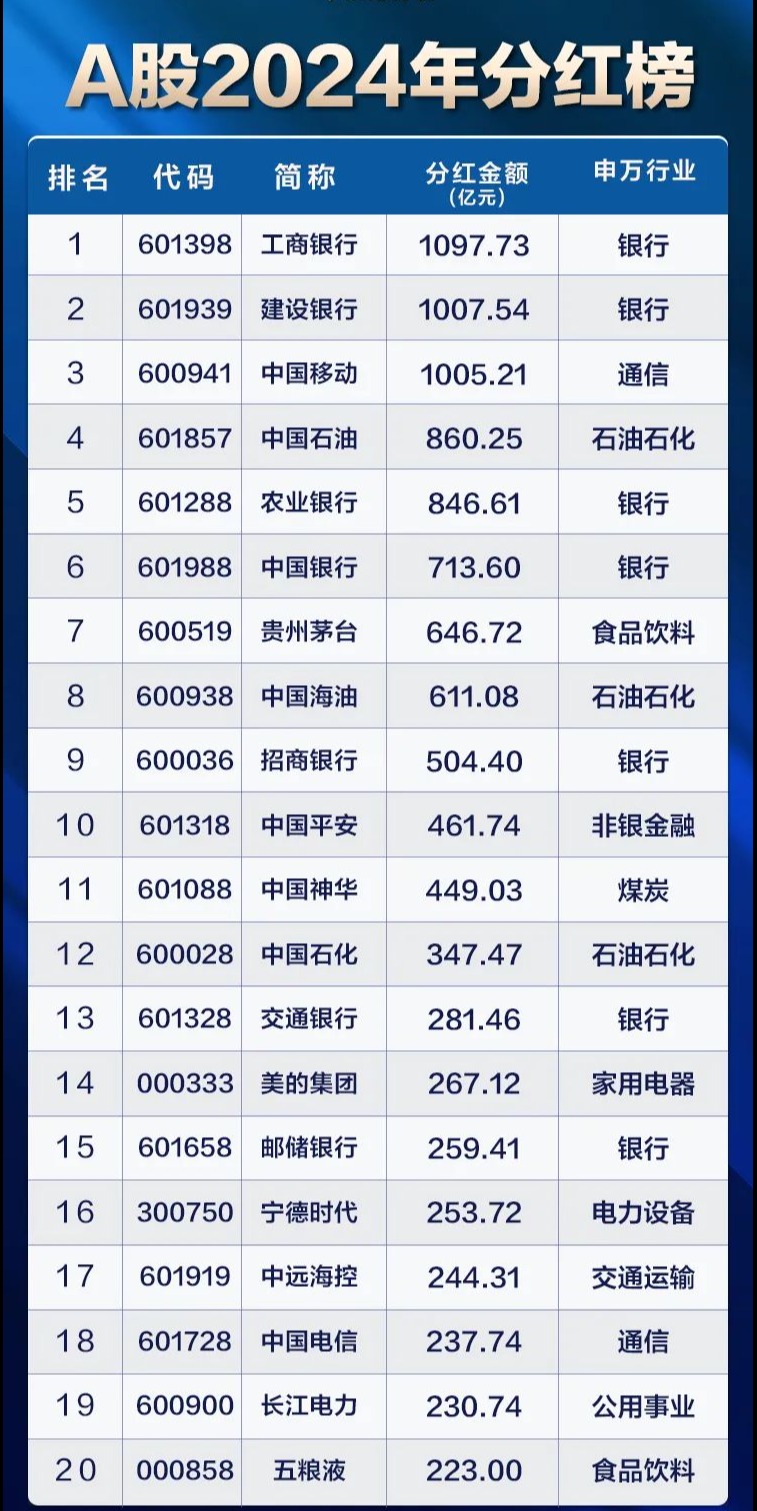 中国移动继续位居第三位,2024年分红首次超过千亿元,达到1005.21亿元。