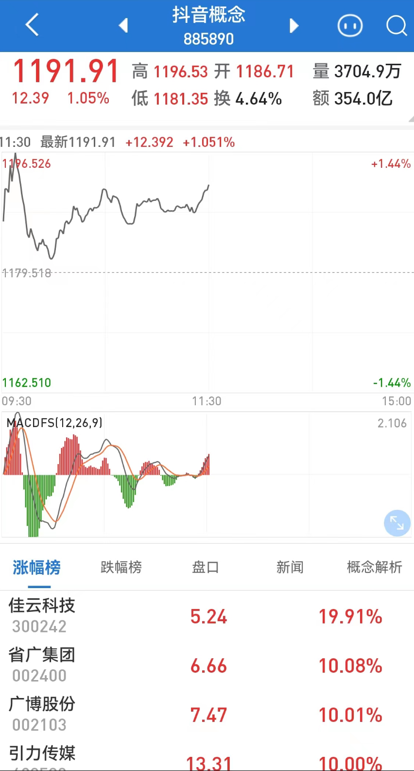 今日,抖音付费概念股集体高开,佳云科技一度冲击20%涨停,引力传媒、广博股份、省广集团涨停,欢瑞世纪、唐德影视等跟涨。