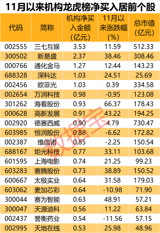 11月机构大幅买入股曝光!5股获机构增持超亿元