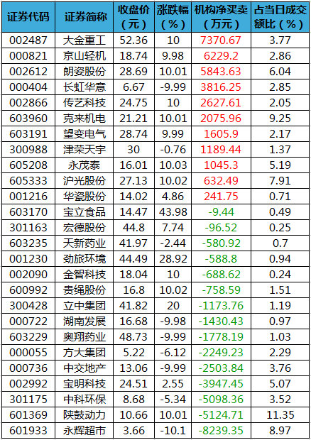 盘后龙虎榜数据显示,今日机构席位资金合计净卖出约1590.01万元。其中,净买入的个股11只,净卖出的个股15只。机构净买入最多的股票是大金重工,净买入金额约7370.67万元;机构净买入居前的还有京山轻机、朗姿股份、长虹华意等股。机构净卖出最多的股票是永辉超市,净卖出金额约8239.35万元。机构净卖出靠前的还有陕鼓动力、中科环保、宝明科技等股。