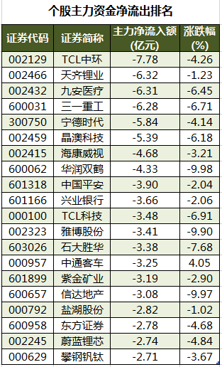 此外,3104只个股被主力资金净卖出,其中,100股被主力资金净卖出超1亿元。主力资金净流出最多的个股是TCL中环,净流出金额为7.78亿元;主力资金净流出居前的个股还有天齐锂业、九安医疗、三一重工、宁德时代、晶澳科技,净流出金额分别为6.32亿元、6.31亿元、6.28亿元、5.84亿元、5.39亿元。