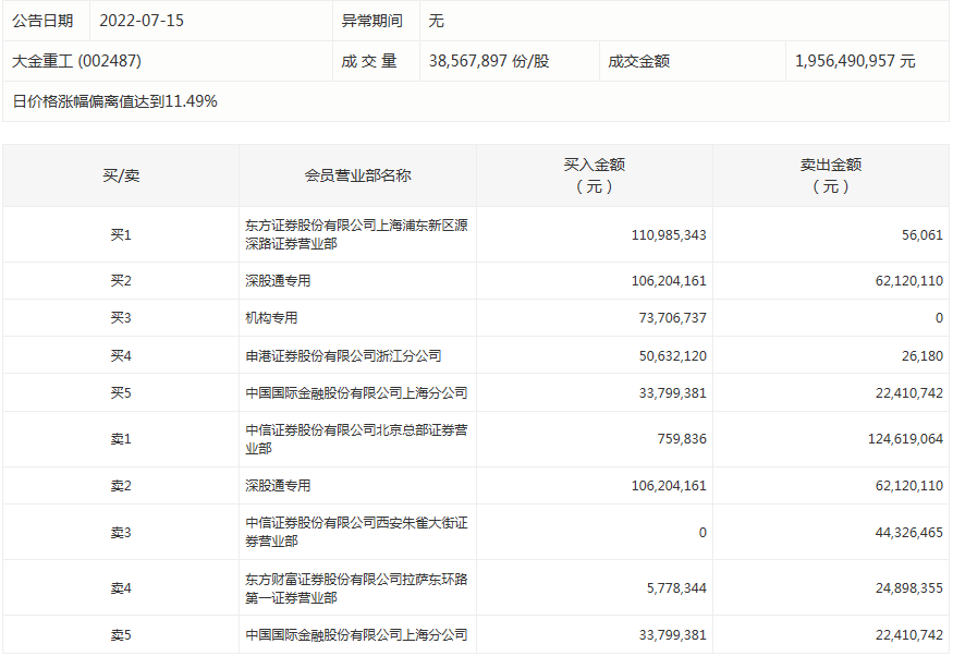 大金重工今天涨停。盘后数据显示,1个机构出现在龙虎榜单上,净买入7370.67万元;东方证券股份有限公司上海浦东新区源深路证券营业部买入1.11亿元,同时卖出5.61万元;中信证券股份有限公司北京总部证券营业部买入75.98万元,同时卖出1.25亿元。