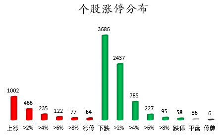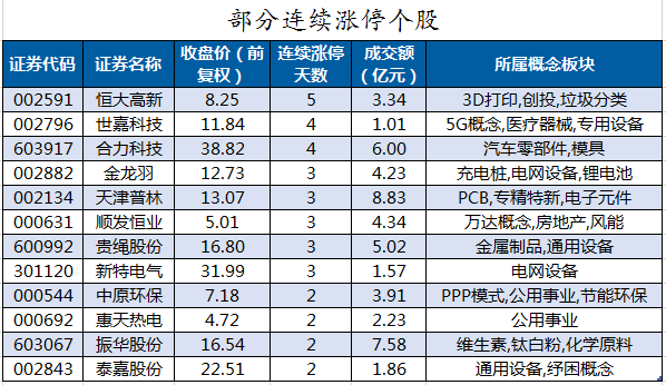 截至收盘,沪深两市合计1002只个股上涨,3686只个股下跌,平盘个股36只,停牌的个股6只。不含当日上市新股,共有64只个股涨停,58只个股跌停。连续涨停天数看,恒大高新已连收5个涨停板,连续涨停板数量最多。