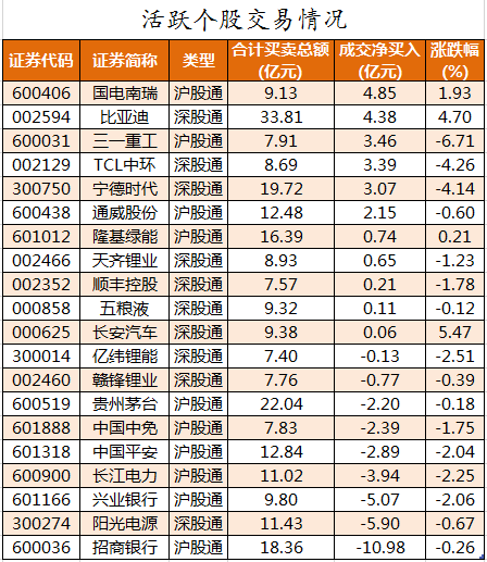 活跃个股方面,北向资金净买入较多的有国电南瑞、比亚迪、三一重工、TCL中环、宁德时代,净买入金额分别为4.85亿元、4.38亿元、3.46亿元、3.39亿元、3.07亿元。北向资金净卖出较多的有招商银行、阳光电源、兴业银行、长江电力、中国平安,净卖出金额分别为10.98亿元、5.9亿元、5.07亿元、3.94亿元、2.89亿元。
