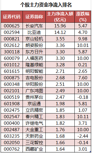 个股来看,今日有1608只个股获主力资金净流入,其中,41股获主力资金净流入超1亿元。长安汽车获主力资金净流入最多,净流入金额为15.96亿元;主力资金净流入居前的个股还有比亚迪、京山轻机、朗姿股份、东方日升、人福医药,净流入金额分别为14.12亿元、3.55亿元、3.36亿元、3.3亿元、3.3亿元。