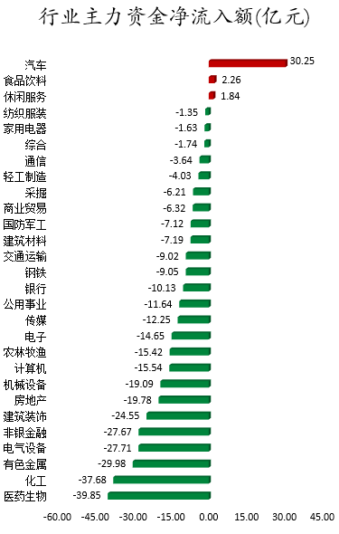 从行业板块来看,申万所属的28个一级行业,今日仅有汽车、食品饮料、休闲服务3个行业板块主力资金呈现净流入,净流入金额分别为30.25亿元、2.26亿元、1.84亿元。25个行业板块主力资金呈现净流出,其中,医药生物行业板块主力资金净流出最多,净流出金额为39.85亿元;行业板块主力资金净流出靠前的还有化工、有色金属、电气设备、非银金融、建筑装饰,净流出金额分别为37.68亿元、29.98亿元、27.71亿元、27.67亿元、24.55亿元。