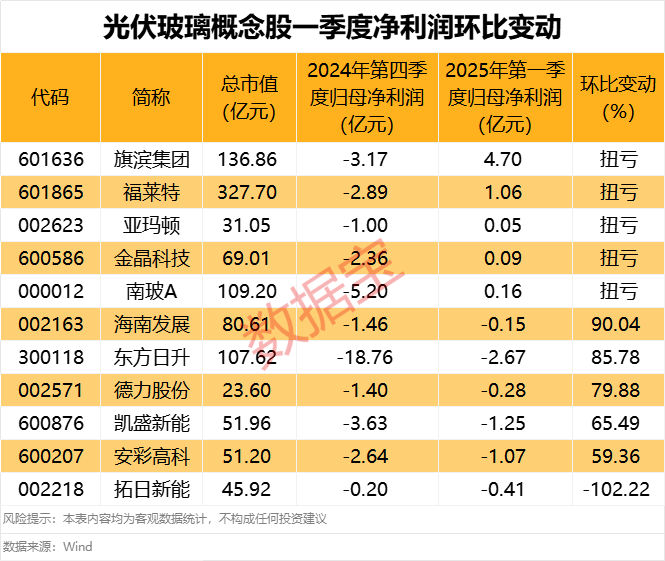 从业绩方面来看,不少概念股今年一季度业绩环比扭亏为盈或减亏,旗滨集团、福莱特、亚玛顿、金晶科技、南玻A一季度净利润均环比扭亏。其中,旗滨集团的扭亏幅度最大,从2024年第四季度亏损3.17亿元,扭亏至2025年第一季度的盈利4.7亿元;公司是一家集硅砂原料、优质浮法玻璃及深加工玻璃、光伏光电玻璃、高性能电子玻璃、中性硼硅药用玻璃研发、生产、销售为一体的大型玻璃企业。