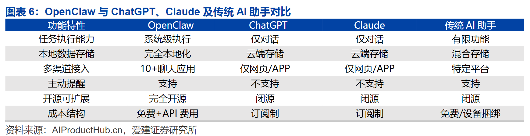 OpenClaw作为一款具备全流程执行能力的开源AI智能体,助力AI实现了从交互到主动执行的突破。它无需专属客户端,可依托日常通讯软件完成交互,拥有文件系统、浏览器、各类API等完整访问权限,能够执行文件读写、终端命令运行、代码编写等多元实操任务。同时其采用本地优先架构,在保障隐私安全的同时实现高效本地执行,还具备跨平台共享对话上下文的长期记忆能力,兼容多款主流大模型。相较于仅停留在对话层面的ChatGPT、Claude以及传统AI助手,OpenClaw可实现系统级任务执行与操作闭环,搭配本地化存储、主动提醒、开源可扩展的特性,形成了突出的核心竞争力。