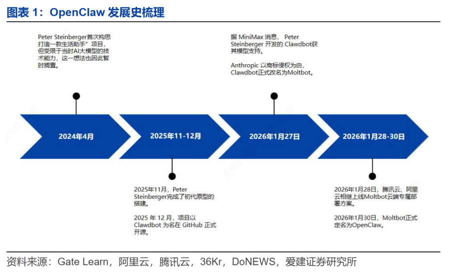 由PSPDFKit创始人PeterSteinberger开发的开源项目,最终定名为OpenClaw于2025年底正式上线,GitHub星标数量快速攀升,并获得MiniMax在模型能力层面的技术支持。