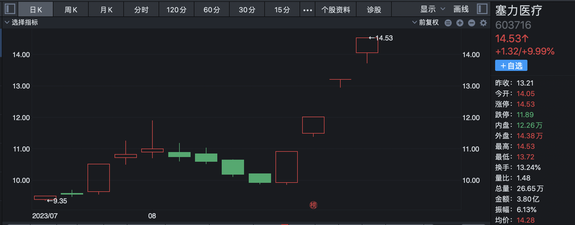 本周二级市场表现来看,已出现回暖迹象,其中以“医疗检验集约化(IVD)+医疗耗材集约化(SPD)”为双主业模式的塞力医疗截至周五收盘斩获四连板,国内生产格列齐特和盐酸罗哌卡因原料药龙头企业科源制药连续四天20cm涨停。