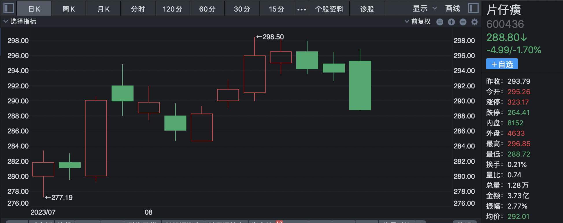 需要注意的是,截至目前,已有多家医药上市公司掌门人、董事长等接连被查。人福医药本周一公告,实控人因涉嫌信披违法违规被立案。此前还包括卫宁健康实控人、赛伦生物实控人、片仔癀董事、副总经理等。不过,从股价反应来看,赶在本轮风暴关口遭实锤的赛伦生物在7月31日股价重挫,日跌幅超11%,而相对较早在5月被曝出问题的片仔癀则走出逆势上涨行情,近两周内累计最大涨幅近7%。