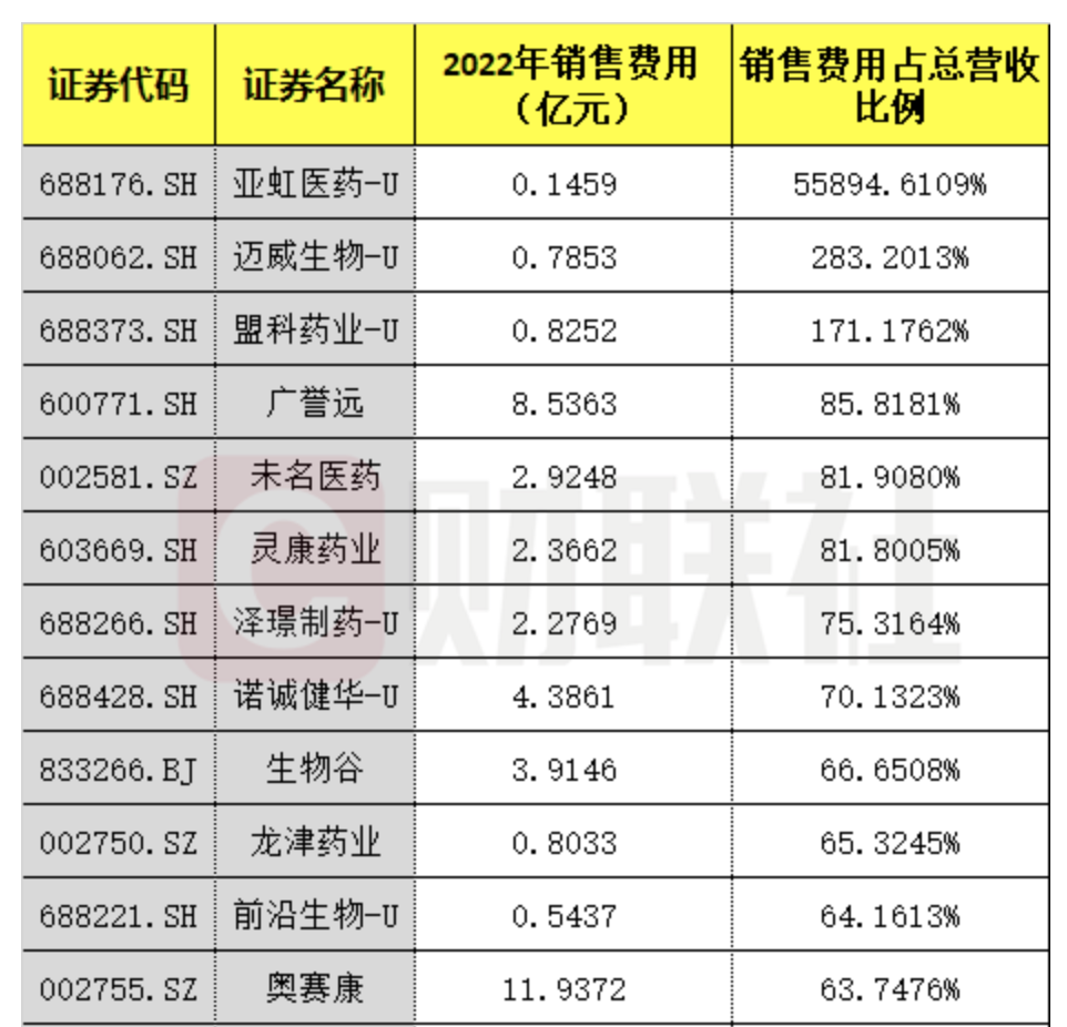 具体到企业方面,更存在着各种“之最”。以2022年的数据为例,上海医药销售额度最高,达140余亿元,值得注意的是,上文提及的恒瑞和百济神州同样位列前六;上海谊众位居增幅首位,去年销售费用相较21年增幅达3741%;在销售人员人均销售费指标中,西藏药业以3100万以上独占鳌头,远超200万元的企业平均值。另外,从销售费用率来看,亚虹医药以高达55894%的比例最靠前,迈威生物销售费用率增长最快,去年占营收比重上升152个百分点。