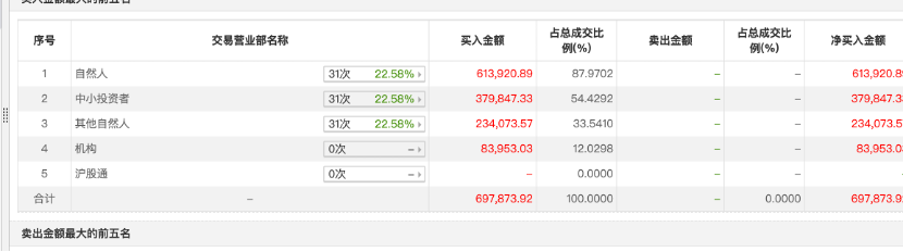 3月27日盘后数据显示,中毅达连续10个交易日内,4次出现正向异常波动。期间,自然人买入61.39亿元,占比87.97%,其中中小投资者占比54.42%,其他自然人占比33.54%;机构占比12.03%。