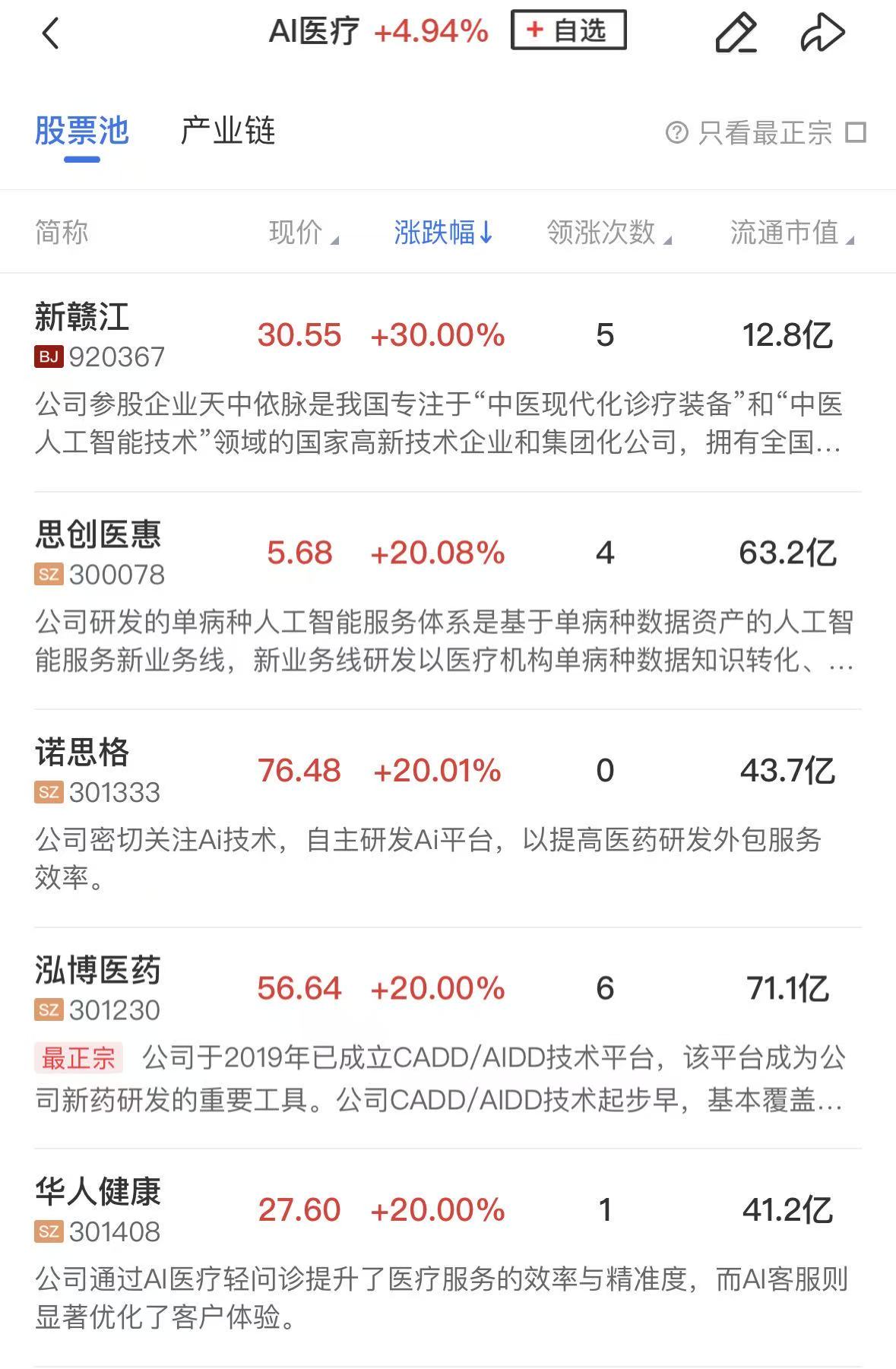 板块上,AI医疗概念股涨幅居前,泓博医药、迪安诊断、博济医药、贝瑞基因、国际医学、美年健康等涨停。