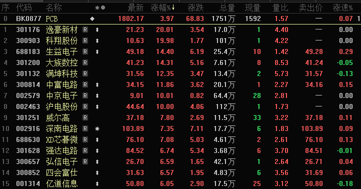 今日午后PCB概念股涨势扩大,胜宏科技一度涨超7%,市值突破1000亿元,续创历史新高。截至发稿,逸豪新材、科翔股份20CM涨停,中京电子、沪电股份10CM涨停,则成电子涨超20%,生益电子、中富电路涨超10%。
