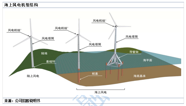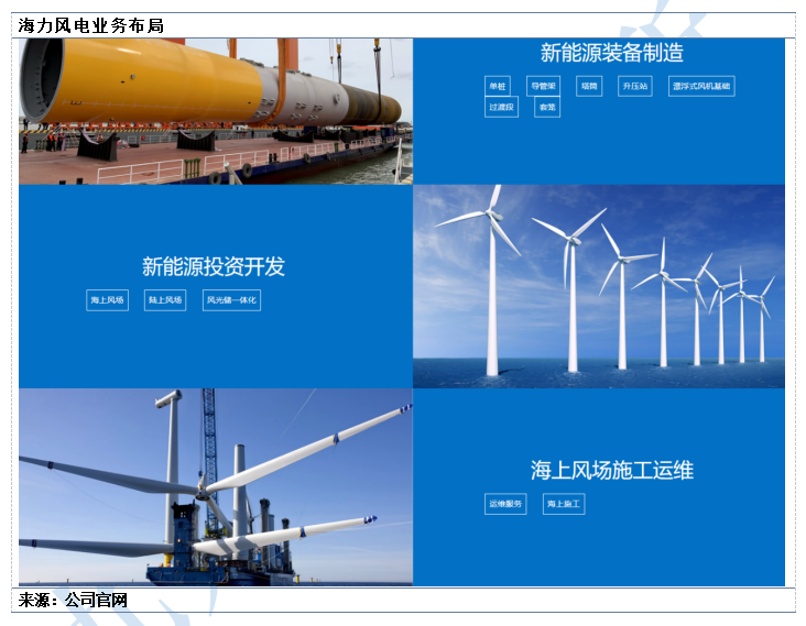 其中,公司主营业务为风电设备零部件的研发、生产和销售,主要产品为风电塔筒、桩基、导管架及升压站等,尤以海上风电设备零部件产品为主,目前产品涵盖8MW及以下普通规格产品和10MW以上大功率等级产品。同时,公司也在持续开拓在新能源开发和风电场施工、运维领域的布局发展。