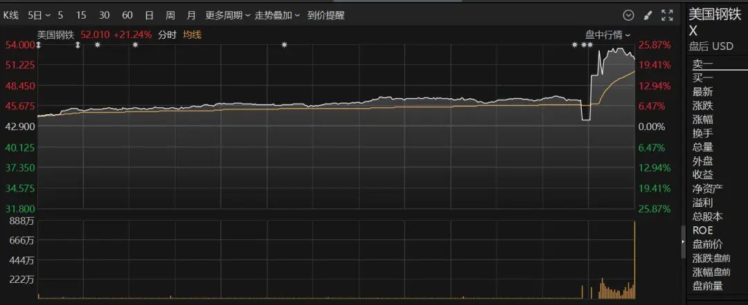 美国钢铁涨超21%,特朗普称美国钢铁和日本制铁同意建立“计划中的合作伙伴关系”。